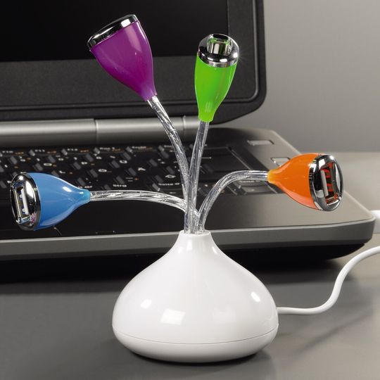 Bleiben wir bei der Floristik. Wenn es nicht eine einzelnen Blume, sondern ein ganzer Strauß sein soll, dann bietet sich für Geschenke zwischen Nerds der 4-fach USB-Hub Flower von Hama im entsprechenden Design an. Die biegsamen USB-Blumen ermöglichen durch den großen Abstand zueinander auch das Einstecken von breiten USB-Sticks oder -Dongeln. Und das Ganze ist mir rund zehn Euro sogar noch günstiger als ein echter Straus – und verwelkt auch nicht so schnell.