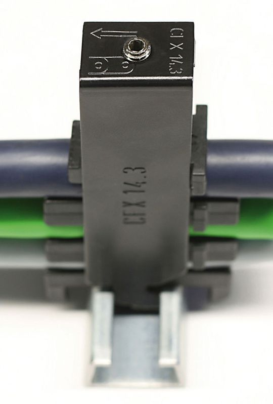Die schmale Baubreite und geringe Bauhöhe der Chainfix-Bügelschellen des Kölner Energieführungs-Spezialisten igus ermöglichen eine optimale Ausnutzung enger Platzverhältnisse direkt im Kunststoff-Metall-Anschlusselement (KMA), oder per separater C-Schiene vor jedem anderen Anschlusselement. Verrippte Kunststoffwannen sorgen für eine kraftschlüssige Verbindung mit den Leitungen und damit für eine sichere Zugentlastung. Die Leitungen bleiben auch bei größten Auszugskräften festgeklemmt, ein Herausrutschen ist nicht möglich.