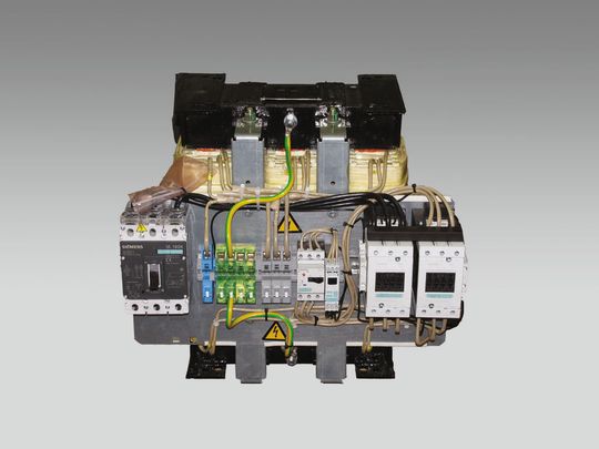 Der Kern seiner Lösung wird mit Komponenten aus dem Siemens-Spektrum realisiert, so z.B. dem Sidac Leistungstransformator 3-phasig 40 kVA bzw. 100 kV, 440 V primär mit Anzapfung 380 V und 220 V sekundär. Die Auslegung der Primärspannungen auf die unterschiedlich zu erwartenden Landanlagennetze legt den Grundstein für alle gelieferten Anlagen. Das „Kleinhirn“ der Umschalteinrichtung bildet das Netzüberwachungsrelais Sirius 3UG4615.