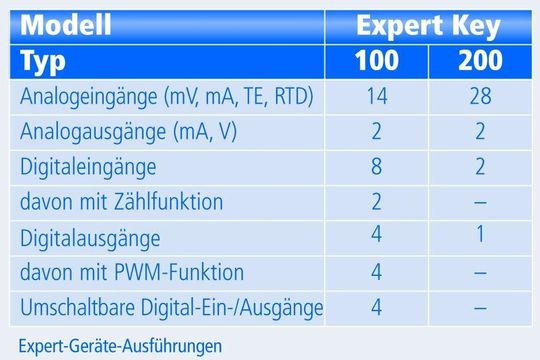Die Messgeräte sind mit wahlweise nutzbarer USB- und Netzwerkschnittstelle ausgestattet, für beide Bauformen ist der Typ 100 oder Typ 200 lieferbar. Expert Key 100 verfügt über einen ausgewogenen Mix aus analogen sowie digitalen Ein- und Ausgängen und ist damit gut für die Prüftechnik geeignet. Expert Key 200 konzentriert sich mit 28 universellen Eingängen stärker auf die analoge Messwerterfassung.