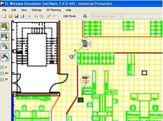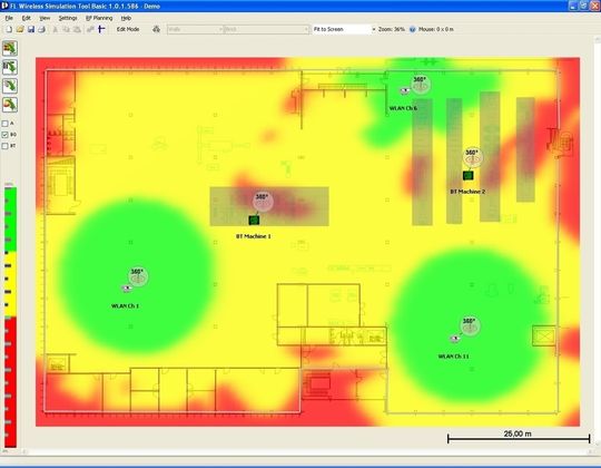 Für eine solche Anwendung bietet die Wireless-Simulations-Software auch dem in Funkanwendungen ungeübten Anwender schon am Schreibtisch eine einfache Möglichkeit, sich schnell einen Überblick über die Ausleuchtung seiner Halle zu verschaffen. Auf Basis des Hallenplans, der als Grafik in die Software-Oberfläche eingebunden wird, entsteht am PC mit wenigen Mausklicks ein genaues Abbild der Industrieumgebung.