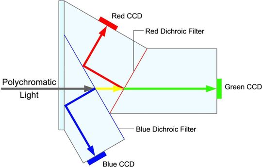 - Bei der 3CCD Prismenkamera wird der in die Kamera eintretende Lichtstrahl über ein Prisma in seinen roten, blauen und grünen Anteil aufgeteilt und auf drei separate CCD-Sensoren geleitet. Der Vorteil bei diesem Verfahren ist, dass die jeweiligen Farbanteile zum identischen Zeitpunkt aufgenommen werden und es zu keinen Farbverschiebungen z.B. an einer Objektkante kommt, einem sogenannter Spatial Effect, auch wenn das Objekt rotiert — etwa bei der Kartoffelinspektion. Nachteile sind die Baugröße der Kamera und die Kosten für die aufwändige Kameratechnologie mit drei Sensoren plus Steuerelektronik sowie die speziellen Objektive.