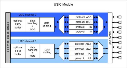 Zusätzlich zu der flexiblen Auswahl des Kommunikationsprotokolls ist die USIC-Struktur dafür ausgelegt, die Systembelastung (CPU-Belastung) zu verringern, was eine sehr effektive Datenverarbeitung ermöglicht (Vollduplex-Datenübertragungen werden unterstützt). Jeder USIC-Kanal enthält einen eigenen Baudratengenerator. Die Baudratenerzeugung kann entweder auf dem internen Systemtakt oder auf einem externen Frequenzeingang basieren. Diese Struktur erlaubt Datenübertragungen mit einer Frequenz, die intern nicht erzeugt werden kann, beispielsweise um mehrere Kommunikationspartner miteinander zu synchronisieren. Zusammen mit der sehr flexiblen Signalzuweisung zu Port-Pins bildet der USIC die ideale Kommunikationsschnittstelle für die Ansprüche der unterschiedlichsten Anwendungen.