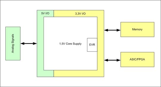 Neu ist die flexible E/A-Spannung von 3 bis 5,5 V. Damit git es die Möglichkeit, zwei verschiedene Domains zu definieren (5 V für analoge Präzisions- und 3,3 V für Standard-Peripherie-ICs). Die Core-Stromversorgung arbeitet mit 1,5 V. Eine geregelte Spannung für den Core wird mithilfe eines Embedded Voltage Regulators aus der E/A-Eingangsspannung direkt auf dem Chip erzeugt, ein separater Spannungsregler wird nicht benötigt. Die Vorteile dieses Konzepts bestehen darin, dass die optimale Eingangsspannung für analoge Signale (Aufschalten von 5-V-Sensorsignalen auf die A/D-Wandler) ebenso wie für digitale Funktionen (digitale Logik, ASICs etc.) bereitgestellt wird. Bei den meisten Anwendungen sind dadurch Level-Shifter für die Signalwandlung zwischen den Spannungspegeln auf der Platine überflüssig.