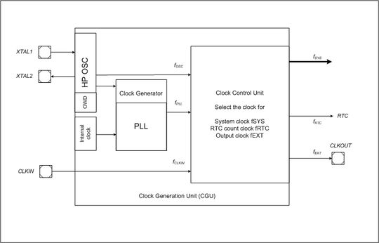 Die hochpräzise Oszillatorschaltung auf dem Chip (OSC-HP, 4 bis 25 MHz, hohe Genauigkeit von max. 0,5 mA) kann einen externen Quarz ansteuern oder akzeptiert ein externes Taktsignal. Eine andere Taktquelle ist der getrimmte stromgesteuerte On-Chip-Oszillator (OSC-LP, 5 MHz, Schnellstart). Auf diese Weise kann der Benutzer die jeweils passendste Taktversorgung wählen. Es steht immer ein entsprechender Takt zu Verfügung, um eine stabilen Betrieb zu sichern. Die Umschaltung zwischen den verschiedenen Taktbereitstellungsmodi erfolgt in der Software. Durch eine interne Notfall-Taktquelle ist ein Taktsignal unter allen Umständen gewährleistet (ohne dass eine externe Taktquelle benötigt wird). Der Oszillator-Watchdog (OWD) überwacht den Eingangstakt und aktiviert den Notfalltakt, wenn das Eingangstaktsignal nicht zuverlässig ist.