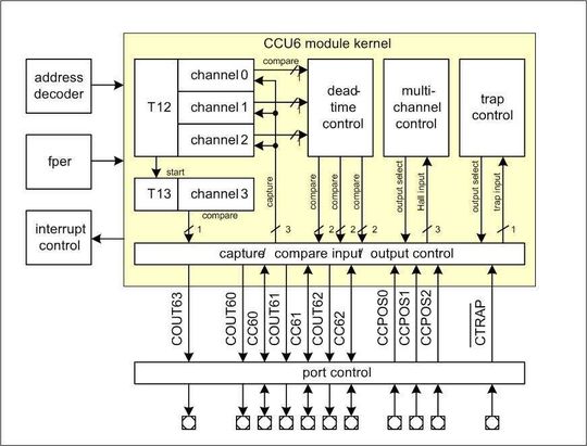 Die CCU6 ist eine hochauflösende 16-Bit-Capture/Compare-Einheit mit anwendungsspezifischen Modi hauptsächlich für Wechselstrom-Motorsteuerung oder Inverter. Spezielle Betriebsmodi ermöglichen die Steuerung von bürstenlosen Gleichstrommotoren mithilfe von Hall-Sensoren oder Back-EMF-Erkennung. Außerdem unterstützt die Einheit Eingänge zum synchronen Starten mehrerer Timer, eine wichtige Funktion für Bauelemente mit mehreren CCU6-Modulen. Die CCU6-Einheit (in den XE166 können bis zu vier integriert sein) besteht aus einem T12-Timerblock mit drei Capture/Compare-Kanälen und einem T13-Timerblock mit einem Compare-Kanal. Die T12-Kanäle können unabhängig voneinander PWM-Signale generieren oder Capture-Trigger akzeptieren bzw. gemeinsam Steuersignalmuster erzeugen, um Wechselstrommotoren oder Inverter anzusteuern. Mit bis zu vier CCU6-Modulen kann die XE166-Familie gleichzeitig maximal vier Dreiphasenmotoren steuern.