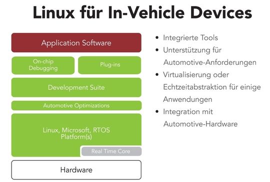 Die Standardisierungsarbeit für zukunftsfähige Super-Plattformen läuft gerade an. So arbeitet Wind River an einer Linux-basierten Lösung und erstellt derzeit eine Architektur, wie ein solcher Infotainment-Stack aussehen könnte – Ziel ist ein Standard mit offen gelegten Schnittstellen, sodass beispielsweise bestimmte Teillösungen von Infotainment-Produkten gegen andere Teillösungen ausgetauscht werden können.