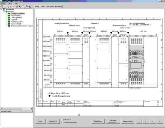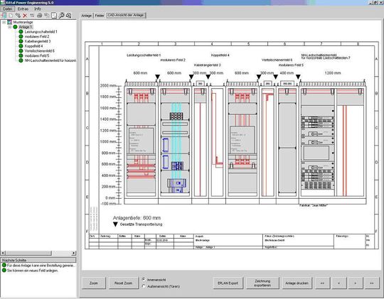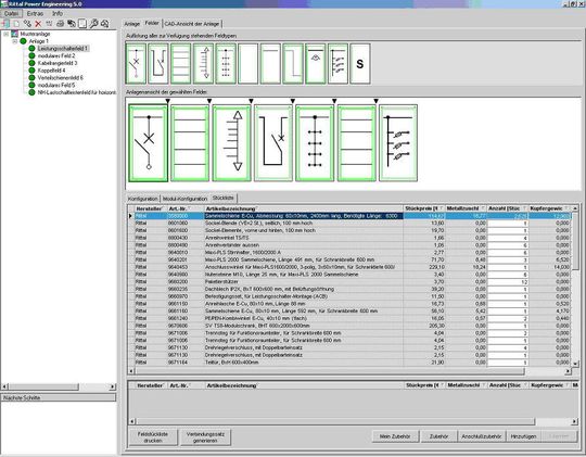Ist ein neues Projekt angelegt, können beliebig viele Schaltanlagen erstellt werden. Nach der Systemauswahl erfolgt eine Abfrage der relevanten Parameter wie Bemessungsstrom, Schutzarten, Schrankabmessungen. Die Software ermittelt durch verschiedene Abfragen die genaue Konfiguration der Anlage. Innerhalb eines Projektes lässt sich aufgrund einer Baumstruktur einfach von Anlage zu Anlage oder auch Feld zu Feld navigieren. Ist die Anlage konfiguriert, können aus dem Programm heraus eine Stückliste, eine CAD-Ansicht oder auch ein Text zum Leistungsverzeichnis ausgegeben werden. Dabei kann der Anlagenbauer schon während der Angebotsphase eine Ansichtszeichnung erstellen. Im weiteren Projektablauf lässt sich auch die Bestellung der notwendigen Komponenten erzeugen. Eine Schnittstelle ermöglicht die Übergabe von Stücklisten und Zeichnungen an Eplan Electric P8. Der Schaltanlagenbauer muss damit nicht mehr die bereits in Rittal Power Engineering zusammengestellten Produktdaten in seinem Eplan-Softwaretool manuell erfassen.