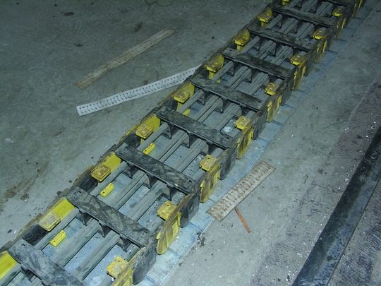 Im MRP (Gerät zum Magazinieren, Reinigen, Plotten), Regalbediengerät, Betonverteiler, Schalungsöler, Hubwagen, Stahlverlege-Roboter, Wendegerät zur Produktion von Doppelwänden sind heute Chainflex-Leitungen im Einsatz. Bei Verfahrwegen bis max. 25 m werden sie stark strapaziert. „Energiezuführungen von igus waren von Seiten des Anlagenbauers bereits vorhanden, aber die werksseitig eingebauten Leitungen waren eine einzige Katastrophe. Wir hatten ständig Probleme mit Korkenziehern und Aderbrüchen“ so der Werksleiter. „Und haben mindestens einmal im Jahr kostenaufwändig an fast allen Anlagen die Leitungen gewechselt.“