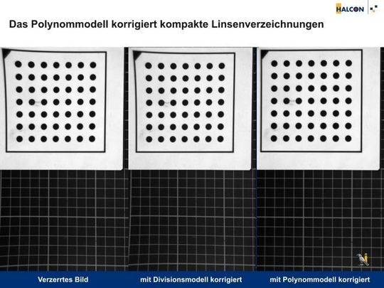 HALCON verfügt über eine einzigartige 3D-Kamera-Kalibrierung – womit sich äußere und innere Kameraparameter bestimmen lassen. Damit können Pixelkoordinaten einfach, schnell und hochgenau in Weltkoordinaten umgerechnet werden, was die Robotersteuerung und -referenzierung erheblich vereinfacht. Das zugrundeliegende Kameramodell für diese 3D-Kalibrierung wurde unter HALCON 9.0 dergestalt erweitert, dass auch komplexe Linsenverzeichnungen sowie Verkippungen der optischen Achse rechnerisch eliminiert werden können. Damit wird die Genauigkeit der Ergebnisse von 3D-Algorithmen erheblich gesteigert.