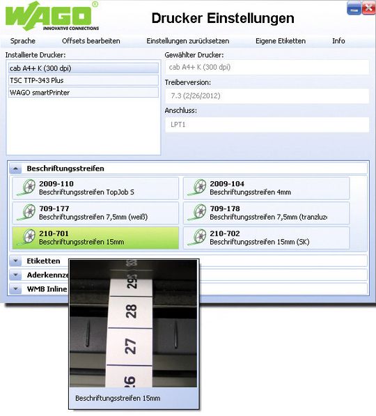 Neben dem Beschriftungsstreifen lassen sich darüber hinaus Beschriftungsschilder, Etiketten, Typen- und Tasterschilder sowie Leiter- und Adermarkierer verarbeiten. Damit ist die Kennzeichnung aller Wago-Klemmen – Reihenklemmen und I/O-Busklemmen – sowie der angeschlossenen Leiter und Kabel mit einem einzigen Gerät möglich.
