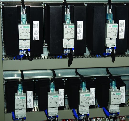 Für die exakte Temperaturregelung verwendet der Anlagenbauer modular aufgebaute Halbleiterschütze, die sehr robust sind und nur wenig Verlustwärme entwickeln. Mithilfe einer optional aufsteckbaren Laststromüberwachung ist er in der Lage, einen Ausfall einzelner Heizelemente sofort zu erkennen. „Für uns ist das sehr entscheidend, damit unsere Kunden Produktionsqualität und Serviceeinsätze in ein optimales Verhältnis bringen können“, fasst Karsten Kowalski die Rahmenbedingungen für die Produktion der elektrischen Lebensadern zusammen.